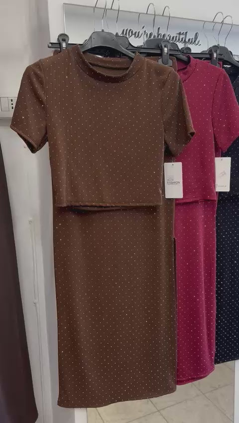 Completo composto da maglia e gonna lunga, ricoperto di strass con spacco che arriva al ginocchio. Veste fino ad una 46.